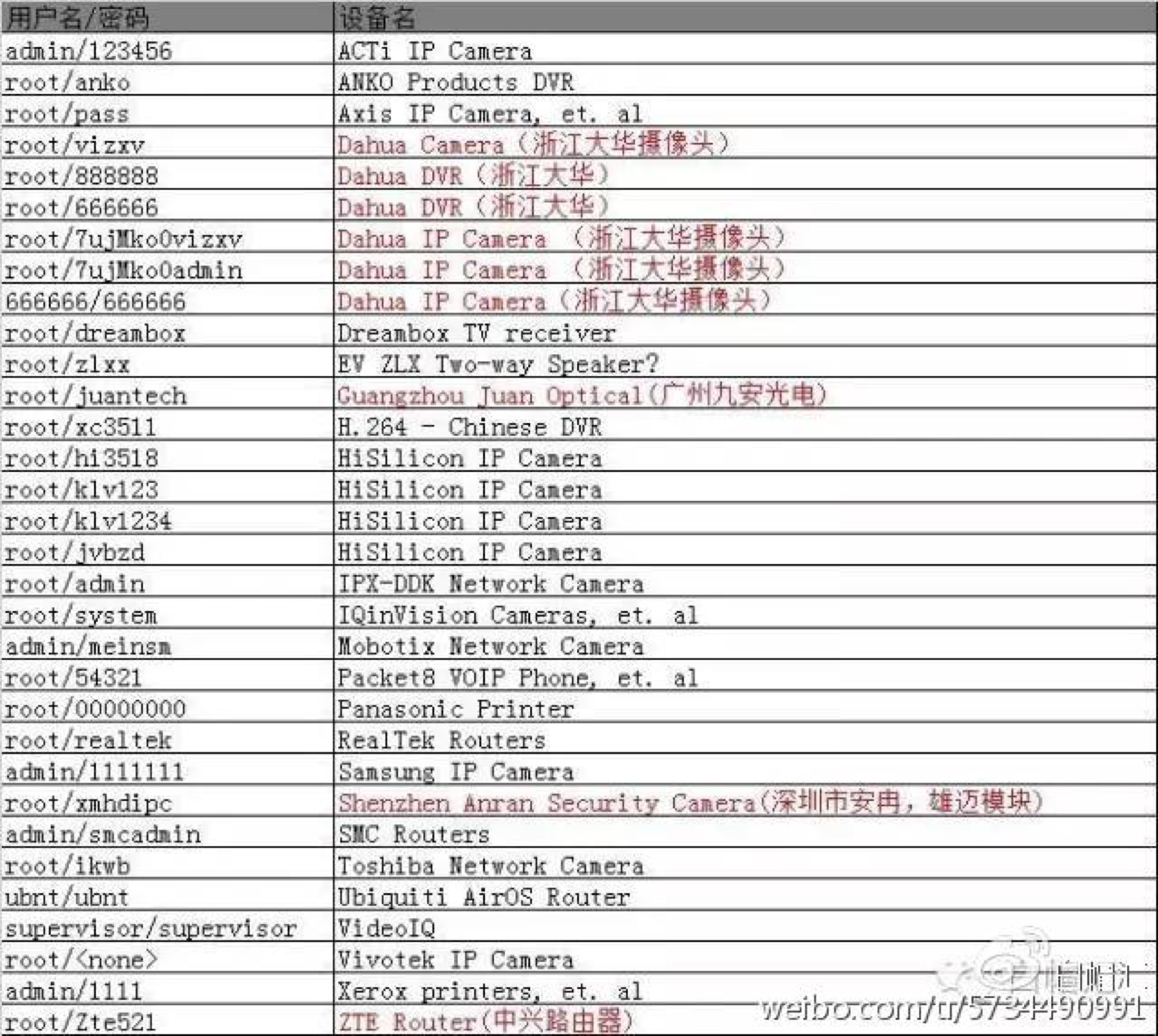 对照下表中已经公开的弱口令可知,前述第一对弱口令是针对雄迈设备的;第二对是针对大华设备的。第三条适用范围较广,没有明确的指向性。